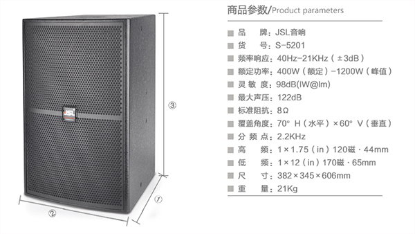 爵士龍KTV音響S系列S-5201,屬于兩分頻音箱,專為娛樂會所設計的專業音箱。
